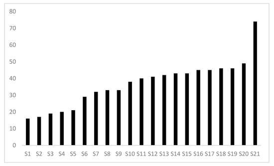 The FCI was tested at 21 rapeseed production sites (Figure 5). With many ‘A,’ ‘B’ and ‘C’ category practices, the S21 system scored FCI = 74, demonstrates it is possible to achieve a satisfactory score above 70 while other systems are scored between 19 to 49. For example, there are no ‘A’ category practices deployed in systems scored < 30, whereas several were implemented in systems scored > 40. This may provide inspiration for the less advanced systems, which, by introducing a few ‘A’ practices, could increase their environmental performance without involving radical changes (e.g., including additional species and cover crops in the rotation, plant hedges around plots, etc.). Although this would not lead to a satisfactory score of 70, it would be the first step towards improving the performance of the given cultural system.