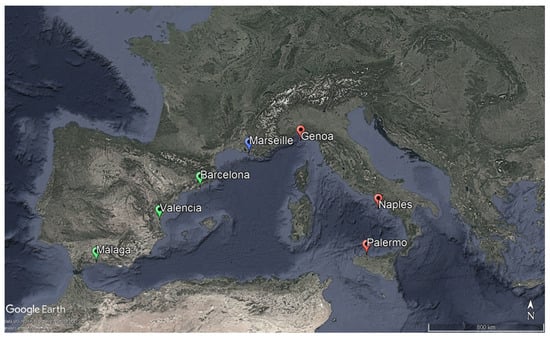 Based on the geo-dataset described above, a subset of seven major cities was selected for in-depth analysis. Considering that all the analysed cities have direct access to the Mediterranean Sea, the selection was guided by the following two main criteria: