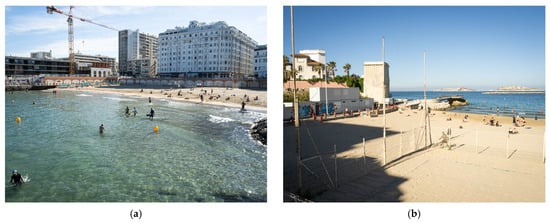 - Cabioch, B.; Robert, S. Les enjeux de la gestion des plages à Marseille. Une mise en perspective avec Barcelone et Valence (Espagne). In Maritimité(s) en Région Provence-ALPES-Côte d’Azur; Bouffier, S., Robert, S., Eds.; L’atelier Méditerranéen, Presses Universitaires de Provence: Marseille, France, 2025; pp. 113–128. [Google Scholar] [CrossRef]