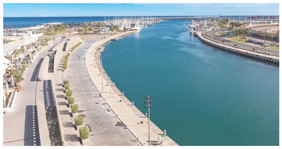 - Llavador, J.M.T. Plan de reordonacíon de la ciudad de Valencia. Proyecto Balcón al Mar—Reorganisation Plan of the City of Valencia. Balcón Al Mar. Project. Portus 2004, 8, 52–61. [Google Scholar]