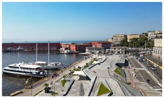 - Salimei, G.; Pavia, R.; Di Venosa, M.; Nava, C.; E. B. S. G. Progetto di Riqualificazione urbanistica, architettonica e funzionale dell’area monumentale del porto di Napoli. Molo Beverello. 2024. Available online: https://hdl.handle.net/11573/467586 (accessed on 28 June 2025).
