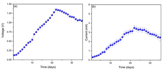 Profiles of (a) voltage (V) and (b) current (mA) as a function of time for single-chamber MFCs with carom residues.