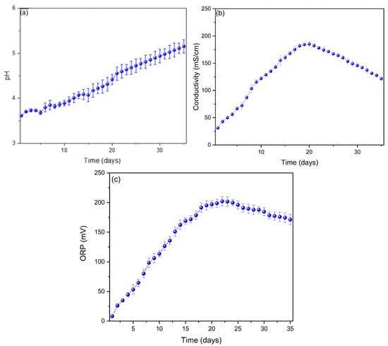 Evolution of (a) pH, (b) electrical conductivity, and (c) oxidation–reduction potential (ORP) in the MFCs.