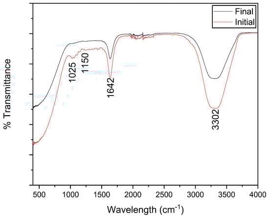 The FTIR spectrum of the carambola waste used as substrates in MFCs is shown in Figure 4, revealing a variety of functional groups key to bioelectrochemical activity. The peak at ~1025 cm−1 corresponds to C–O stretching in alcohols, ethers, or carboxylic acids, indicative of carbohydrates and phenolic compounds present in the biomass [41]. The signal at ~1150 cm−1 is associated with C–O of esters or C–N of amines, which may derive from pectins and proteins [42]. The band at ~1642 cm−1 is interpreted as a composite signal primarily attributable to δ(H–O–H) bending of adsorbed water and/or C=C stretching of unsaturated compounds (e.g., lignin fractions), with a possible contribution from the C=O stretching of conjugated carboxylic/ester groups; the contribution of amides cannot be confirmed in the absence of an unambiguous Amide II band (~1540 cm−1) [41,42]. Comparing the initial and final spectra, changes in the intensity of these peaks suggest degradation of carbohydrates, lipids, and proteins during the MFC process [43]. This chemical transformation indicates the conversion of organic matter into electrons and protons, promoting energy generation [44]. Thus, FTIR not only confirms the rich biodegradable composition of star fruit waste but also evidences the role of its degradation in the system’s electrochemical performance. Other studies describe FTIR characterization of phytochemical extracts, such as those from Carica papaya, indicating the presence of alcohol and amine groups correlated with antifungal effects [45]. Similarly, FTIR analyses of chitosan derived from Pleurotus eryngii confirmed the presence of functional groups (OH, C–H, C=O, and N–H bending) and structural modifications resulting from deacetylation, factors related to its antimicrobial efficacy [46].