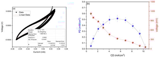 (a) Linear fit voltage versus current curve and (b) power density and voltage as a function of current density.