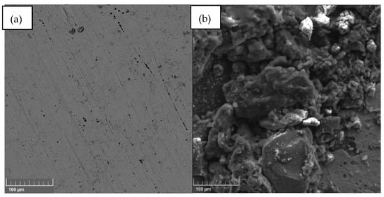 Figure 6 presents two micrographs of the anode electrode from the MFC fed with carambola waste, comparing its initial state (Figure 6a) and final state (Figure 6b) after the operation period. Both images, captured at a 100 µm scale, reveal significant morphological changes resulting from the bioelectrochemical process. The initial micrograph shows a relatively smooth surface, with minimal imperfections and scarce particle accumulation characteristic of an unused electrode, reflecting a high availability of clean active area for microbial colonization and electron transfer. After use in the MFC, the final micrograph displays a markedly rougher and more heterogeneous surface coated with an irregular layer comprised of microbial biofilms, reaction products, and possible mineral precipitates. This biofilm provides evidence of electrode colonization by electroactive microorganisms responsible for oxidizing the organic matter in the carambola waste and transferring electrons to the external circuit [51]. The increased roughness can enhance electrode–microorganism contact, boosting electron transfer efficiency, although excessive accumulation of products and precipitates may also introduce additional internal resistance [52]. These changes confirm the capacity of carambola substrate to promote active microbial growth and sustain the energy generation process. They also demonstrate that the substrate–microorganism–electrode interaction produces physical modifications affecting both performance and durability of the MFC system, key information for optimizing electrode design and materials [53].