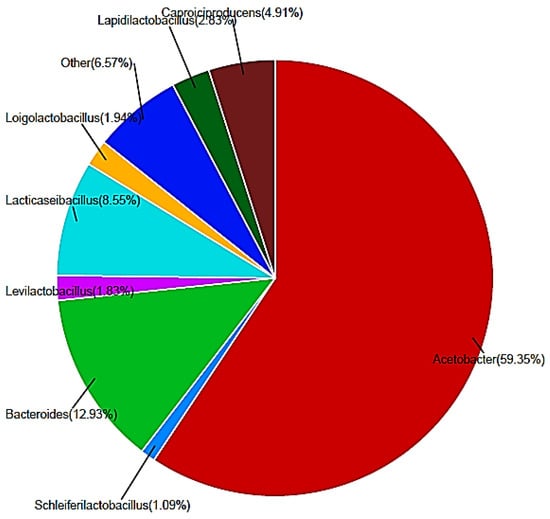 Figure 7 presents the metagenomic profile of the anodic biofilm from a microbial fuel cell fed with carambola residue, showing the composition at the species and genus levels. In both cases, a strong dominance of Acetobacter (59.35%) is observed, a group associated with incomplete oxidation of ethanol and sugars, suggesting its key role in degrading compounds present in the substrate and transferring electrons to the anode [54]. Second, Bacteroides (12.93%), indicating fermentative activity and the ability to degrade complex polymers present in the fibrous fraction of carambola waste. The presence of Lactisaseibacillus (8.55%) and other lactobacilli such as Lapidilactobacillus, Loigolactobacillus, Levilactobacillus, and Schleiferilactobacillus (together ~7.7%) suggests metabolic pathways producing organic acids that could serve as intermediates for electrogenic bacteria [55]. The detection of Caproiciproducens (4.91%) is notable, as this genus is linked to medium-chain fatty acid production—compounds of interest for bioenergy and synthesis of value-added products [54]. The “Other” group (~6.6%) reflects residual microbial diversity, which may include minority species with complementary functions in the bioelectrochemical ecosystem. The profile suggests a microbial community structured around metabolic synergies: primary fermenters, acid producers, and oxidizing/electrogenic bacteria [54,55]. Treatment of MFCs with rhamnolipids demonstrated an increase in the relative abundance of signal-transduction genes in exoelectrogens from 4.56% to 5.86%, corresponding to a rise in coulombic efficiency from 19.10 ± 0.79% to 27.39 ± 1.07% [56]. Additionally, substrate-specific metagenomic evaluations comparing systems fed with molasses and acetate quantified PCR product concentrations of 30 ng/µL for MFC1, 58.6 ng/µL for MFC2, 69.1 ng/µL for MFC3, 53.2 ng/µL for MFC4, and 18.2 ng/µL for MFC5, indicating variable nucleic acid yields that may reflect differences in microbial community composition [57].