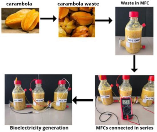 In Peru, carambola (Averrhoa carambola) represents a tropical fruit with high rejection levels in markets and collection centers due to aesthetic criteria, size, or ripeness [19,20]. These residues, rich in moisture and acidity, generate leachates, vectors, and emissions if not properly managed [21]. Although there is no specific data on carambola, the country produces about 23 thousand tons of solid waste daily, of which, only 1.8% is recycled [22]; 78% could be valorized, especially the organic fraction. Given its composition rich in sugars and organic compounds, starfruit waste can be efficiently used in microbial fuel cells, emerging technologies that convert waste into bioelectricity through microbial communities [23]. These MFCs can power environmental sensors, public lighting systems, or low-consumption rural applications. Furthermore, they promote the circular economy by revalorizing waste, reducing emissions, and supporting local entrepreneurship in agricultural areas [24]. The innovation lies in transforming carambola waste into bioelectricity through microbial fuel cells, offering a sustainable and decentralized energy source.