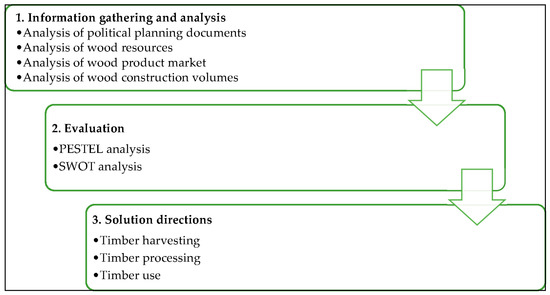 In order to assess the potential for promoting timber construction as a means of advancing Latvia’s climate neutrality objectives, the authors developed and applied an evaluation methodology comprising three principal stages (see Figure 1).