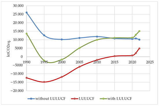 Dynamics of the LULUCF sector in Latvia, 1990–2022 (developed by the authors, based on [27]).