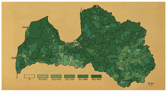 - Proportion of Forests in 1935 and Early 2018. Central Statistical Bureau. 2019. Available online: https://stat.gov.lv/lv/statistikas-temas/vide/dabas-resursi-geografiskas-zinas/publikacijas-un-infografikas/5222-mezu?themeCode=DRP (accessed on 8 August 2025).