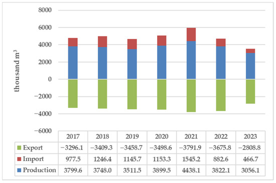 - Statistical Database. Production, Exports and Imports of Wood Products 2017–2023. 2023. Available online: https://stat.gov.lv/en/statistics-themes/business-sectors/forestry/tables/mek010-production-exports-and-imports-wood (accessed on 20 May 2025).