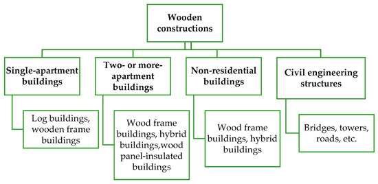 - There are limitations on constructing large timber buildings, related to material fire safety requirements, transport conditions, and building durability. Therefore, this study specifically focuses on building types where timber construction faces no significant restrictions, such as private houses, ancillary buildings, and small public buildings, as well as appropriately sized engineering structures.