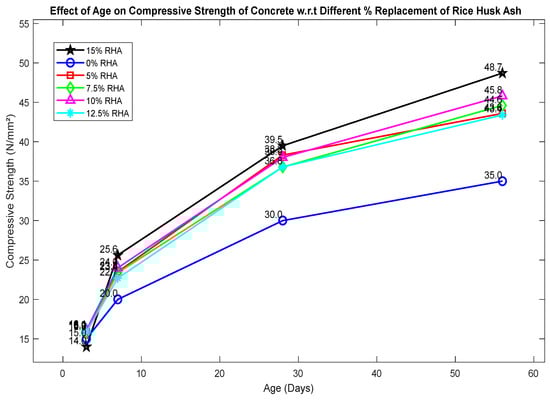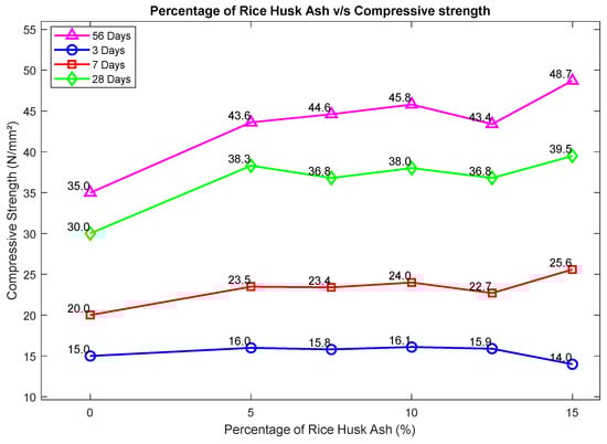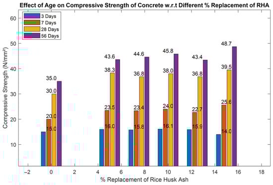 Compressive strength increased steadily with curing age. The optimum was at 7.5% RHA, reaching 37.6 MPa at 56 days, 3.5% higher than the control []. At replacement levels above 10%, strength declined due to dilution effects [,].