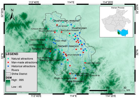 Research area (The map shows the boundaries of Shihe District and its topographic variation. Natural, man-made, and historical attractions are marked with green, red, and blue points, respectively. Major rivers, reservoirs, and mountain ranges are labeled to illustrate the ecological setting. The inset map indicates the location of Shihe District within Henan Province).