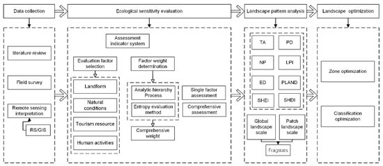 This study adapts established ecological sensitivity and landscape pattern analysis methods but introduces innovation by incorporating tourism-specific indicators, a dual AHP–entropy weighting approach, and the integration of eco-ethical zoning principles. This study develops an integrated research framework that combines landscape eco-ethics with tourism planning to guide sustainable landscape optimization (Figure 2). The analysis follows a multi-step process: First, a comprehensive dataset was established through literature review, field surveys, and remote sensing data processing. Core data layers included land use, topography, hydrology, and tourism resources. Second, ArcGIS 10.8 was used to perform both single-factor and composite ecological sensitivity evaluations, incorporating multiple ecological and socio-environmental indicators [26,27]. Each factor was assigned a weight and spatially analyzed to generate a composite sensitivity map.