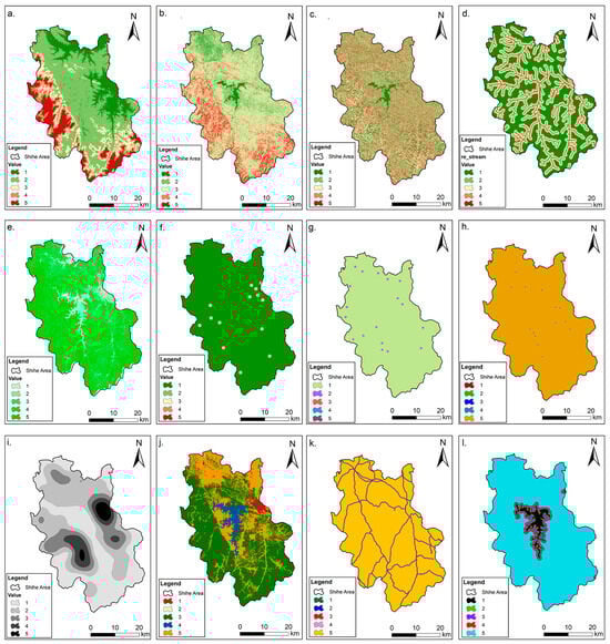 Single-factor ecological sensitivity evaluation map. (a) Elevation; (b) Slope; (c) Aspect; (d) River buffer zone; (e) Vegetation coverage; (f) Historical attractions; (g) Natural attractions; (h) Man-made attractions; (i) Density of attractions; (j) Land use type; (k) Road buffer zone; (l) Lake buffer zone.