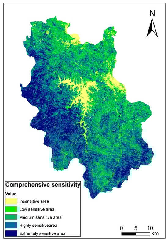 Based on the weighted integration of all sensitivity factors, a composite ecological sensitivity map of Shihe District was generated through GIS overlay analysis (Figure 4), with area statistics summarized in Table 5. The district is divided into three broad sensitivity levels, each requiring differentiated management strategies.