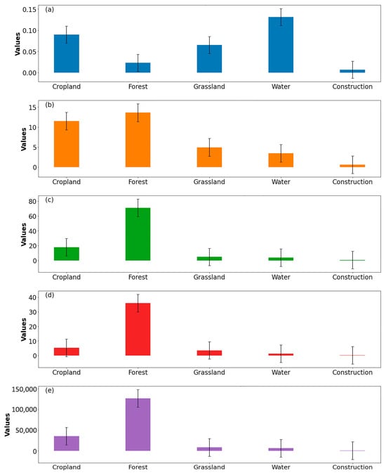 Index of landscape pattern of patches. (a) PD (Patch Density) values for different land types. (b) ED (Edge Density) values for different land types. (c) PLAND (Percentage of Landscape) values for different land types. (d) LPI (Largest Patch Index) values for different land types. (e) CA (Class Area) values for different land types.