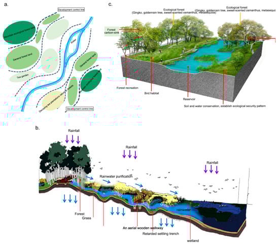 Shihe District Landscape Optimization Diagram. (a) Zoning schematic of ecological and development control areas. (b) Cross-section of ecological water management and rainwater purification system. (c) 3D visualization of forest, water, and ecological functions for tourism and conservation.
