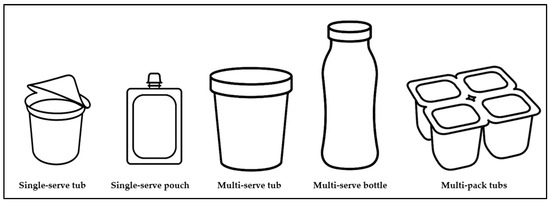 The images were interrogated to classify packaging configurations according to their container type (tub, pouch, or bottle), and size (single-serve, multi-serve, and multi-tub packs). Figure 1 shows images of yoghurt packaging configurations, which were generated using an AI-based image creation tool (Microsoft Copilot 2025) to represent container types and sizes visually. These images were created solely for explanatory purposes and do not depict specific commercial products.