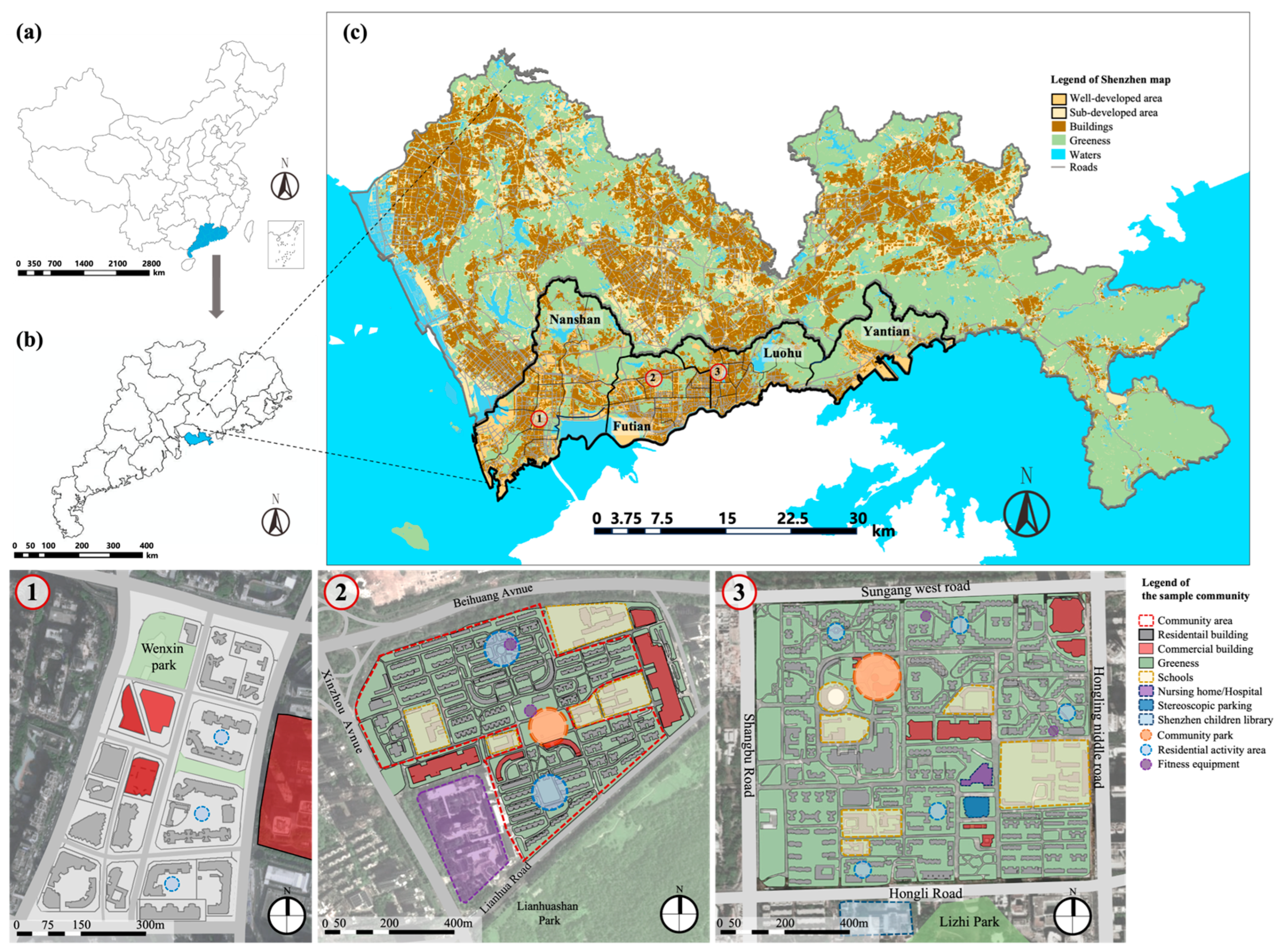 - Lianhua North Community (LNC): A government-developed community located in the core area of Futian District, characterized by low-rise apartment complexes (primarily 5–7 stories). There are 6052 households and approximately 18,000 people in the entire community, of which 16.2% are permanent elderly residents.