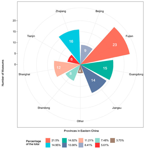 Figure 1, which is based on the data in Table 2, is a radial chart that offers a clear visual depiction of the number of private art museums in different provinces of Eastern China. The regional distribution of private art museums highlights the role of both economic prosperity and cultural policies in driving museum establishment. Fujian stands out with the highest number of museums, contributing 21.5% of the total, followed by Guangdong and Jiangsu, each representing a significant portion of the total (14.02% and 13.08%, respectively). Beijing, Shandong, and Tianjin show fewer establishments, indicating that museum development is concentrated in certain economically prosperous regions, particularly in the southeastern part of China. Museums in economically prosperous regions like Fujian, Zhejiang, and Guangdong prioritize interactive design, creating spaces where the boundaries between art, architecture, and the audience become less distinct. The place-making strategies in these regions emphasize not just the physical layout of museums but also the social engagement of visitors within the space.