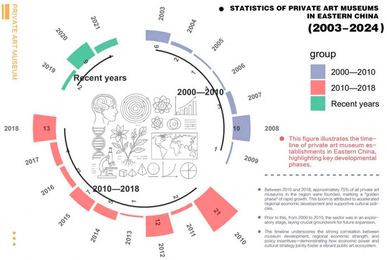 Figure 2 illustrates the timeline of private art museum establishment in Eastern China, reflecting significant place-making trends. The rapid growth of museums between 2010 and 2018 was driven by favorable economic conditions and cultural policies, which not only facilitated the physical expansion of museums but also supported the creation of meaningful cultural spaces. During this period, museums became key sites for place-making, where efforts to foster a sense of place through design and programming contributed to the formation of unique identities within cities. The growth also highlights the role of place branding, as museums sought to position themselves as cultural landmarks, building distinct identities that resonated both locally and globally, attracting public engagement and contributing to urban regeneration.