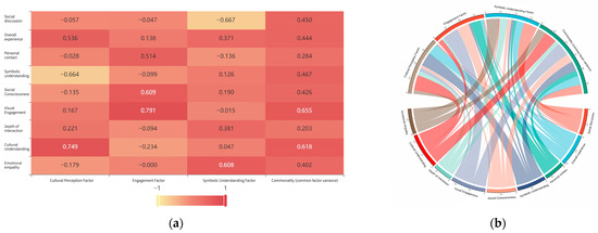 As shown in Figure 4a, the Cultural Understanding Factor is most strongly linked with Emotional Empathy (0.749) and Visual Engagement (0.791). This means that visitors’ emotional connections with the artwork depend on how much they understand the cultural narratives behind the exhibit. The strong link between Cultural Understanding and Emotional Empathy shows that exhibitions designed to help visitors learn about culture also increase emotional engagement, which makes the sense of place stronger.