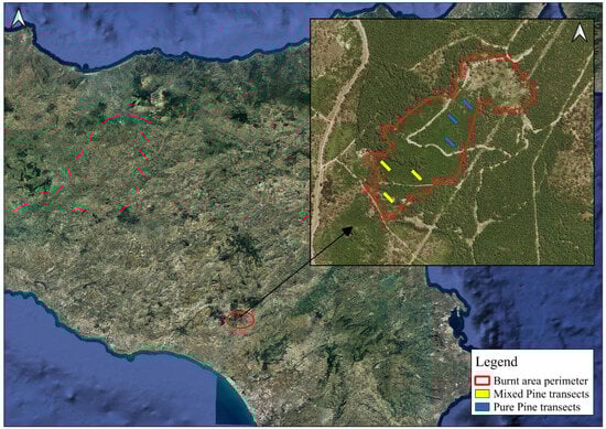 Location of the study area in Sicily (southern Italy). The polygon indicates the perimeter of the area burned. Sampling transects were established within two stand types: pure pine forest (red symbols) and mixed pine forest (yellow symbols).