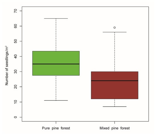 Variability and median values of number of seedlings m−2 recorded in the Pure pine forest and Mixed pine forest, represented as box-plot distributions. In the box plot, the horizontal line is the median and open circles are outliers. Statistical significance of differences between stand types is reported in Table 2.