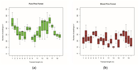 Variability and median values of number of seedlings m−2 in each square meter along the transect of Pure pine forest (a) and Mixed pine forest (b), represented as box-plot distributions. In the box plot, the horizontal line is the median.