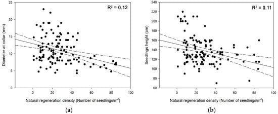 Relationship between number of seedlings per m2 (post-fire natural regeneration) and diameter at collar (a) and seedling height (b). Data from both stand types were pooled to show the relationship between seedling growth and regeneration density. R2 is the determination coefficient.