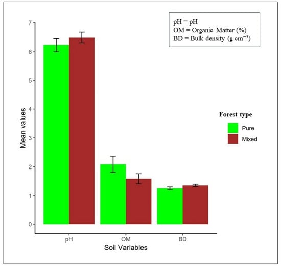 Soil analysis revealed significant differences between the two stand types (Table 2). The pure pine forest exhibited a lower pH (mean = 6.23 ± 0.22) compared to the mixed pine forest (mean = 6.49 ± 0.19), suggesting slightly more acidic conditions (Figure 5). Organic matter content was significantly higher in the pure pine forest (2.08 ± 0.28%) than in the mixed pine forest (1.58 ± 0.17%). In contrast, bulk density was lower in the pure pine forest (1.25 ± 0.05 g/cm3) compared to the mixed pine forest (1.35 ± 0.04 g/cm3), indicating better soil porosity and structure in areas with denser regeneration.
