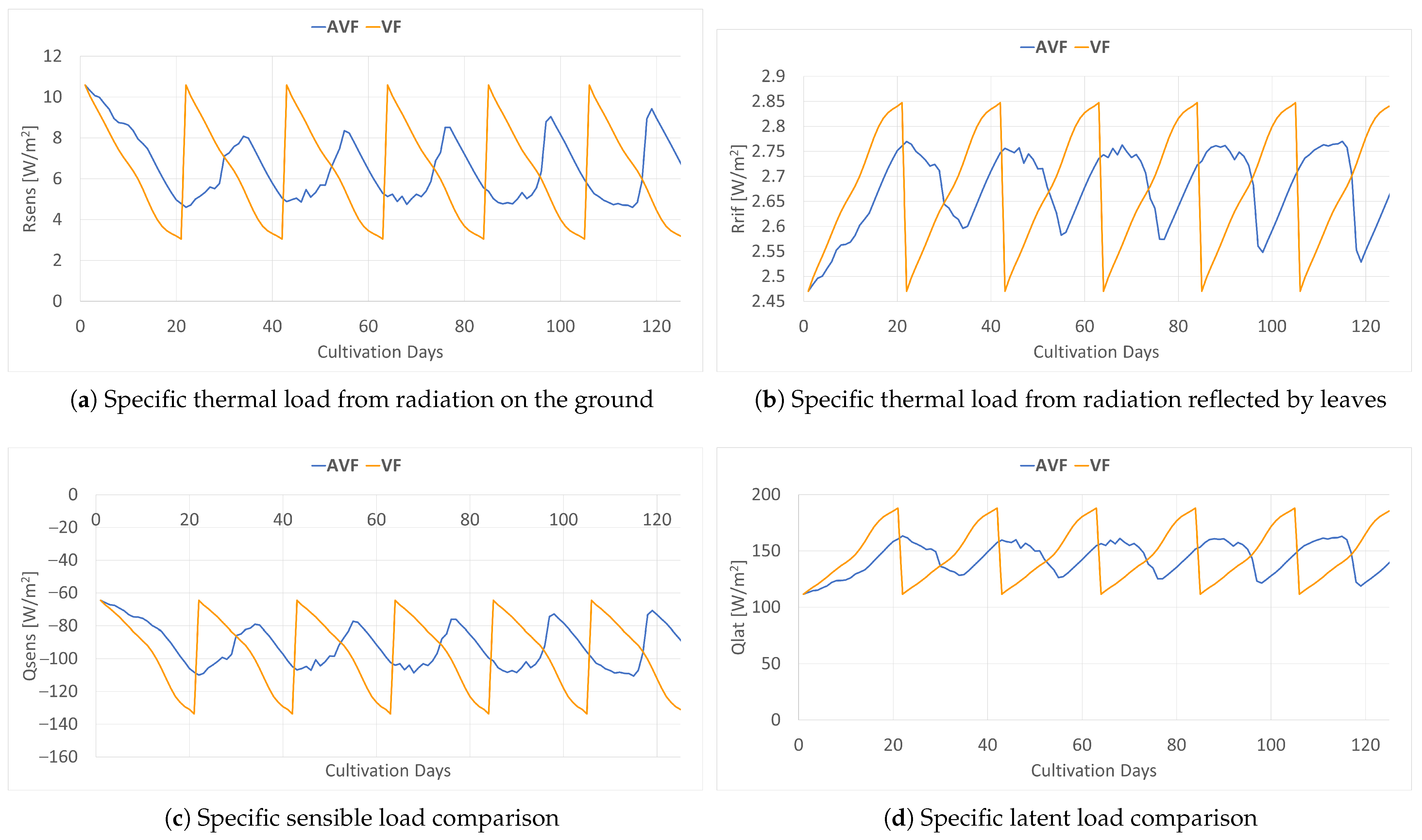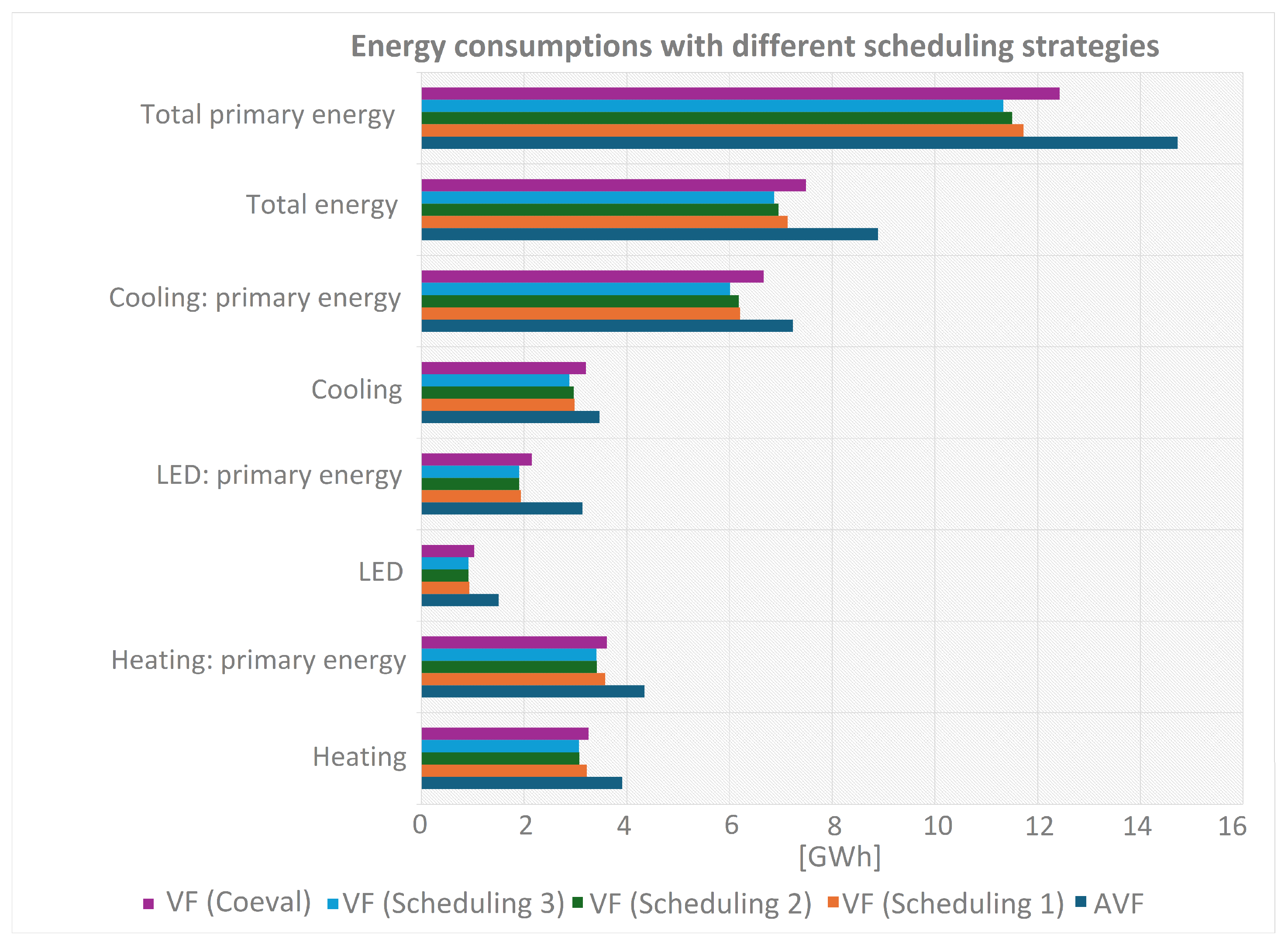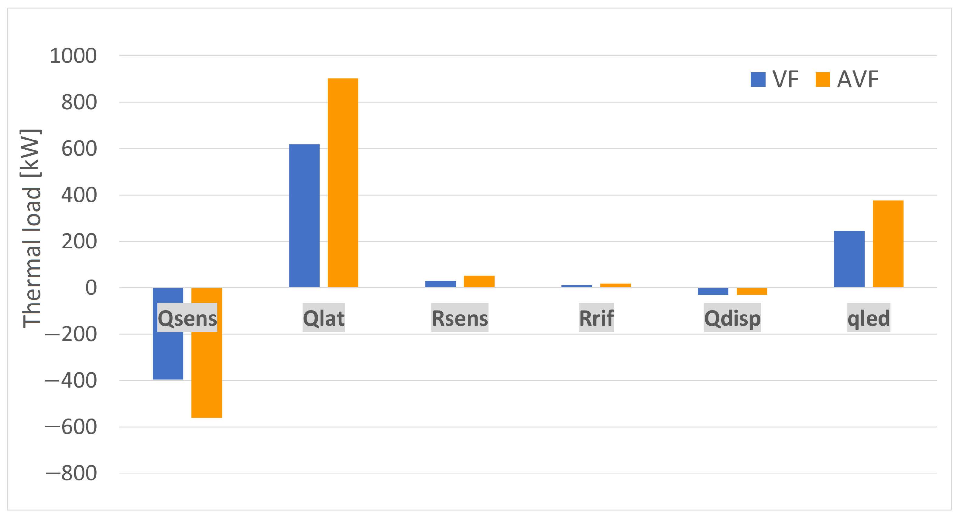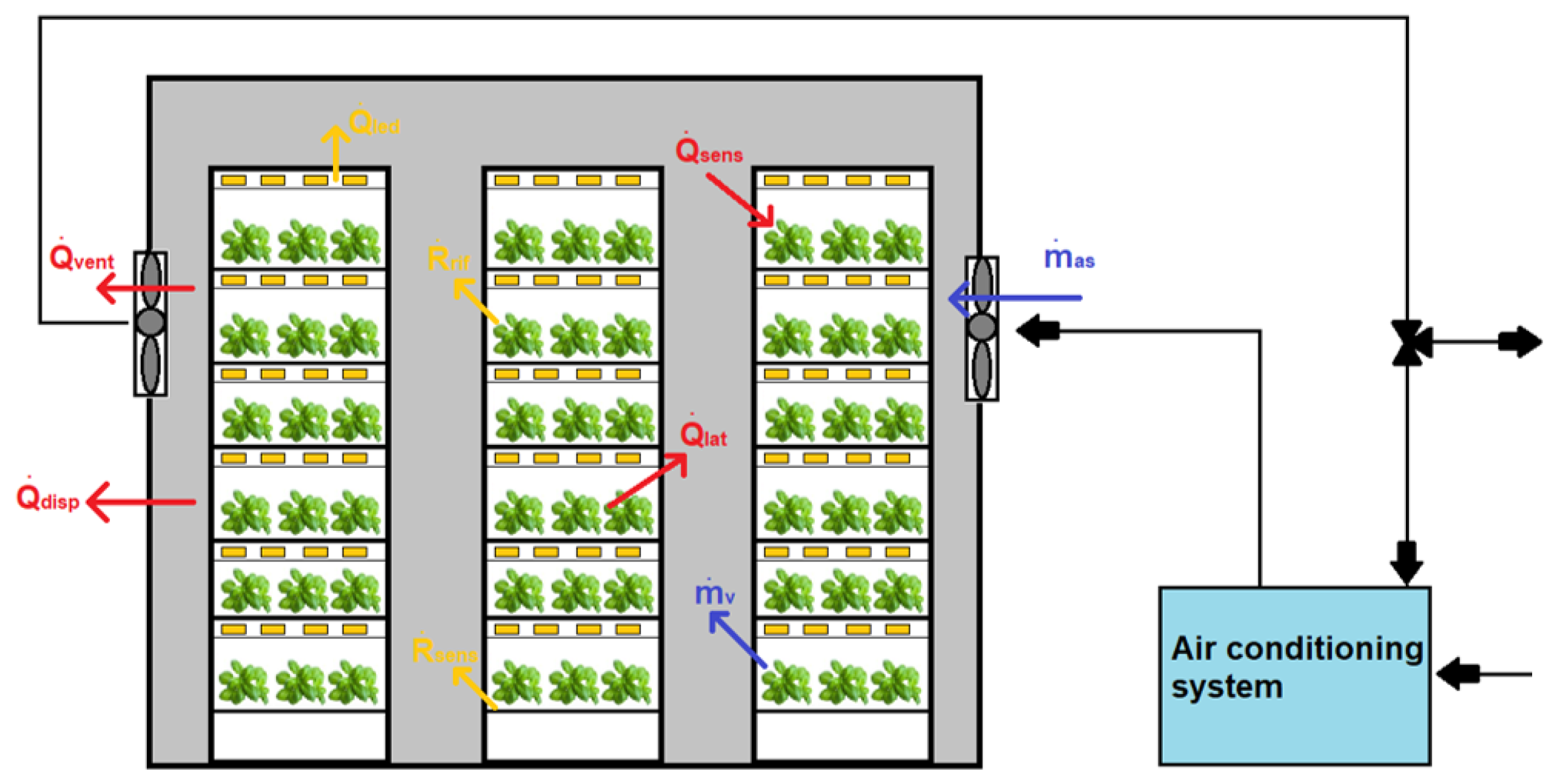 - is a contribution related to air exchange within the shellThe conditioned volume is given by the base area of 1358 m2 multiplied by the height of the structure (6.5 m). It is assumed that the 272 racks occupy a portion of this volume equal to 35% in the traditional vertical farm and 40% in AVF. As the air handling system is an HVAC system, the term is included in