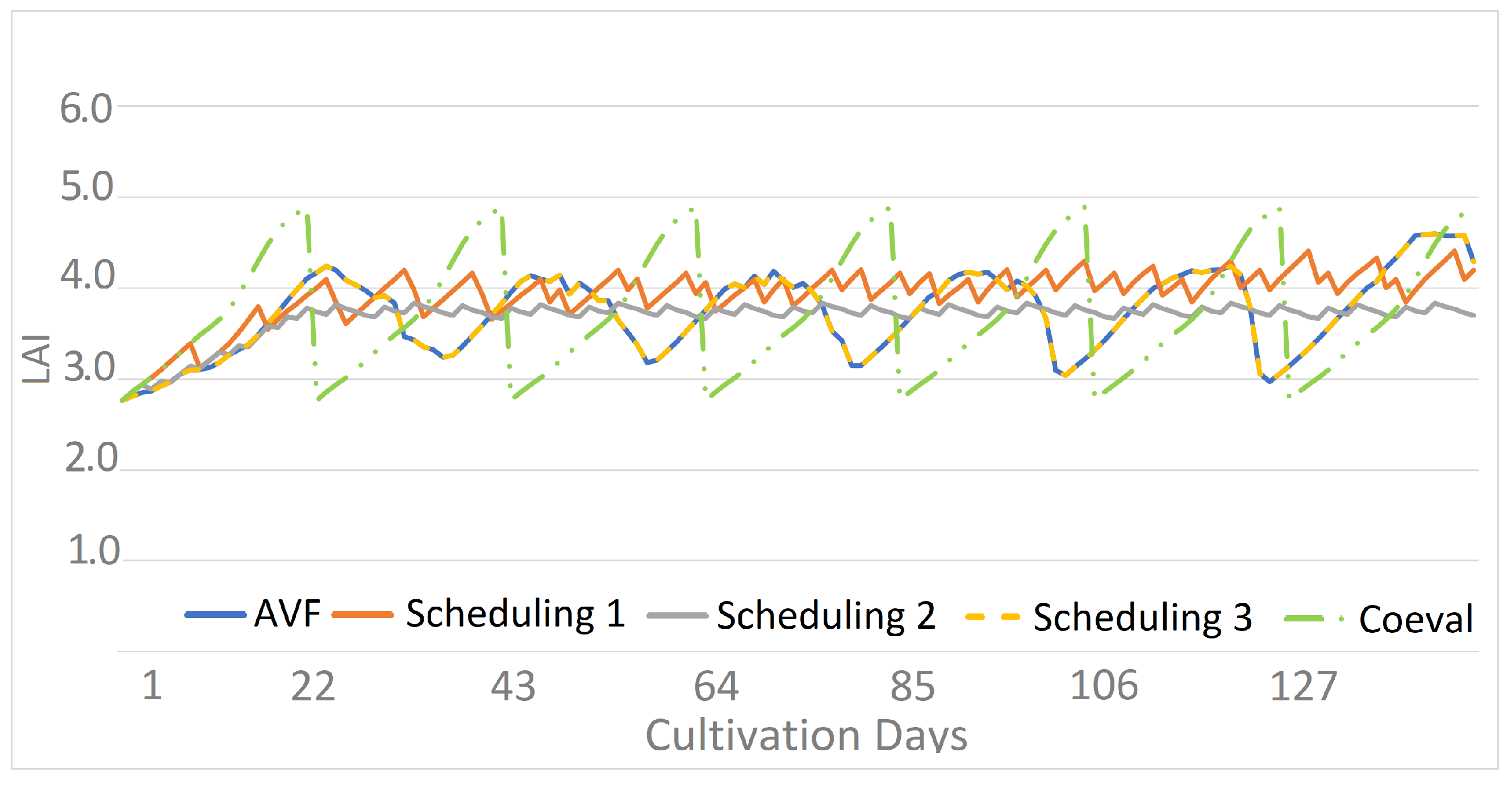 - Scheduling 3: The algorithm used to decide the transplantation days is the same as in AVF; in this case, the racks are divided into 15 groups: 13 groups of 18 racks and 2 groups of 19 racks. In this case, the algorithm decide by group and not by shelves.