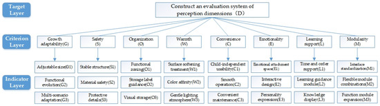Based on the GSOWCELM model, a hierarchical needs model for children’s cabinets was developed via the Analytic Hierarchy Process. It employs eight dimensions as the criterion layer and 24 indicators under them as the indicator layer (Figure 1).