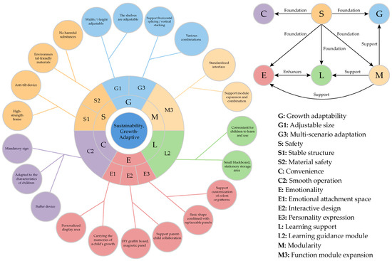 Based on the key indicators identified through the GSOWCELM model—including Emotional attachment space, Personality expression, and Learning guidance module—this section establishes a mapping framework between key perceptual dimensions and tangible design elements (Figure 2). This mapping mechanism facilitates the translation of subjective user perceptions into concretely designable and evaluable modular solutions, thereby establishing a closed-loop logic that integrates “perception, function, and module” into a coherent design process.