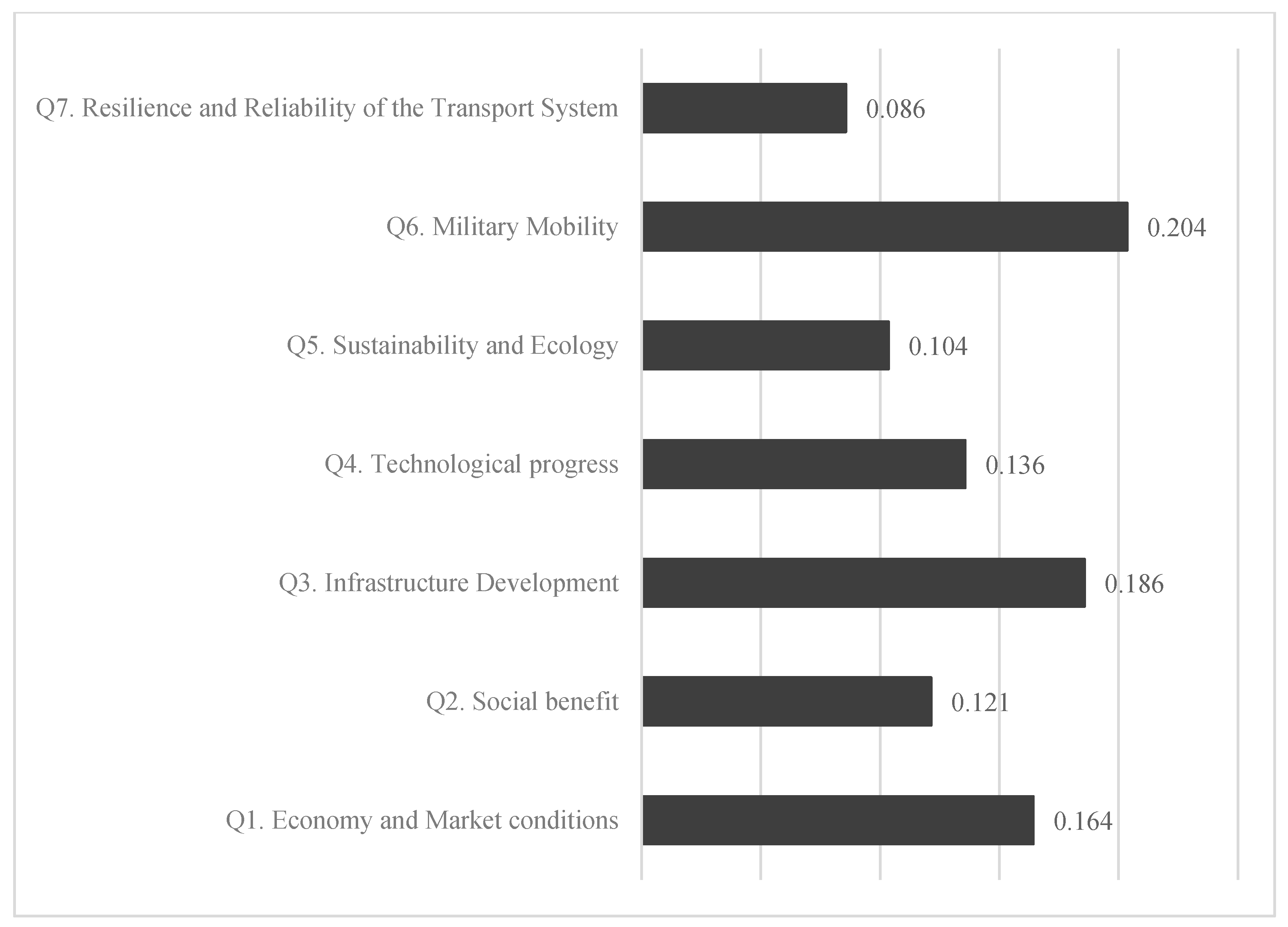 The outcome from 10 expert surveys was that the Military Mobility criteria group should be adjusted first (0.204), second place—Infrastructure Development (0.186), third place—Economy and Market Conditions (0.164), fourth place—Technological progress (0.136), fifth place—Social Benefit (0.121); other criteria weights for the sustainable development and integration of the different 1435 mm and 1520 mm gauge rail systems are provided in