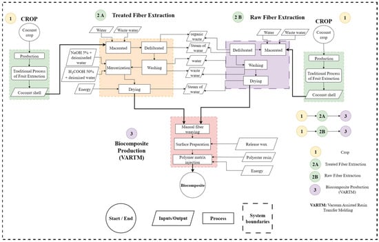 For this study, the most recent year of production of immature green coconut was considered, taking into account on-site utilization, followed by fiber extraction and biomaterial production on a laboratory scale, using 1 kg of this as a functional unit (Figure 1). The approach used was from cradle to manufacturing with a cut-off that allowed the production phase to be established as the starting point, given that plantations in the area are decades old (which complicates possible data collection) and their establishment was not motivated by demand for fiber. As noted in the “Cut-off” Section of the research conducted by [], they state that the cut-off point is used when the limitation does not substantially alter the conclusions and also if there is a lack of data. In addition, coconut is a perennial crop that lasts for many years. Similarly, it is assumed that coconut cultivation and harvesting for meso-carp is not currently being carried out, but rather that the residues are being used as a form of recycling [].