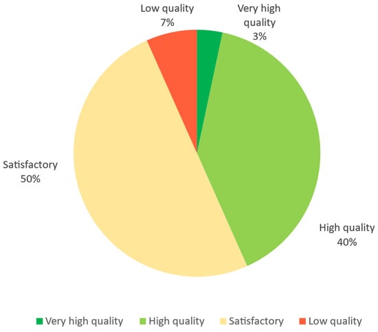 Regarding data quality analysis, the results showed that 50% of the data were of satisfactory quality, followed by 40% of high quality and 3% of very high quality, the latter result due to the fact that the data could be replicated up to three times in its collection. (Figure 2). The technology and methodology used to collect the data are standardized. Furthermore, the data were collected very recently and were taken directly from the study area (the characterization of wastewater generated in the maceration process). In contrast to this result, only 7% of the data were obtained with low quality, with results of 3.51 (not far from the lower limit of 3.2 and not very close to the upper limit of 4). As explained in the previous section, reference is made to “steam water” in the drying of fibers and losses due to evaporation in the defibering process, where mass balances were used, assuming that what was emitted was steam water. Table 4 presents the results of data quality analysis for each of the processes that were part of the research.
