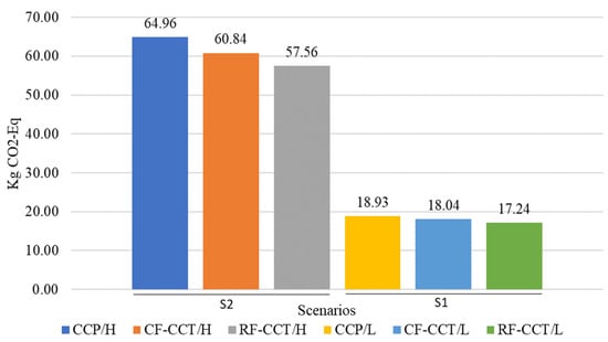 With regard to the comparison between treated and untreated fiber scenarios, those involving chemical treatment showed the highest CO2 emissions. In group S1, treated fibers emitted 3.28 kg CO2-eq more than the non-utilization scenario, while in group S2, the difference was 0.80 kg CO2-eq. These results suggest that the most environmentally favorable scenario is RF CCT/H, which achieves a high replacement level while reducing emissions by 7.40 kg CO2-eq compared to the non-utilization scenario in S1. Similarly, in RF CCT/L, emissions were 1.70 kg CO2-eq lower than in the non-utilization scenario of S2. These differences are mainly attributed to the fiber extraction stage. By avoiding chemical treatment, inputs such as acetic acid and sodium hydroxide, whose production contributes significantly to emissions, are no longer required. As [] noted in a study using banana fibers, scenarios with untreated fibers showed a lower environmental impact due to the absence of energy-intensive chemical processes. Likewise, ref. [] assessed the environmental impact of alkaline treatment on abaca fibers and found that conventional chemical treatment significantly increased emissions. Specifically, the carbon footprint of alkaline treatment was 1.48 kg CO2-eq per kilogram of fiber, which was three times higher than that of untreated natural fibers, at 0.47 kg CO2-eq/kg.