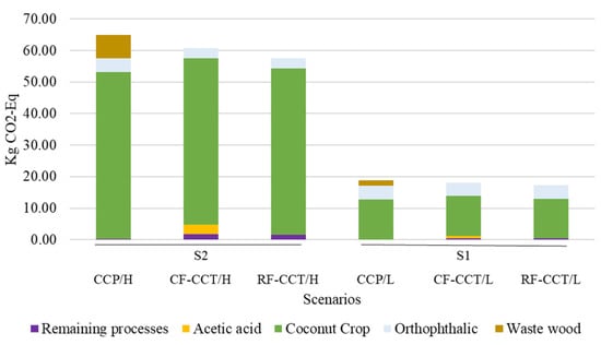 The results indicate that scenarios incorporating coconut fiber lead to a reduction in carbon footprint compared to those involving conventional practices. For instance, in S2, the CCP/H scenario resulted in emissions of 64.96 kg CO2-eq, while the CF-CCT/H and RF-CCT/H scenarios showed lower values of 60.84 kg CO2-eq and 57.56 kg CO2-eq, respectively. A similar trend is observed in the S1 group, where CCP/L recorded 18.93 kg CO2-eq, compared to 18.04 kg CO2-eq for CF-CCT/L and 17.24 kg CO2-eq for RF-CCT/L (Figure 3). The main reason for this reduction in carbon footprint lies in the elimination of the open-air burning of coconut waste, a common practice in conventional scenarios, and the reintroduction of this waste into the circular economy, as can be seen in Figure 4, which shows the sources of emissions by process, where open burning for S1 and S2 accounted for 11.36% and 9.3% (CPP/H and CPP/L).
