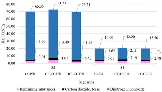 Consequently, as can be seen in Figure 4 and Figure 5 (the latter showing the sources of emissions by substance), this impact category increased in all the scenarios analyzed, due to N2O emissions generated during the cultivation phase. These emissions accounted for 93.4% in the CCP/H scenario, 89.6% in CF-CCT/H, 93.9% in RF-CCT/H, 77.5% in CCP/L, 74.6% in CF-CCT/L, and 77.6% in RF-CCT/L, respectively. The application of fertilizers generates emissions of nitrogen compounds into the air as a result of volatilization due to nitrogen that is not fully assimilated by plants [,]. This powerful greenhouse gas has a significantly higher global warming potential than carbon dioxide (CO2). Its warming potential is estimated to be approximately 270 to 310 times greater than CO2 over a century, making it a critical focus in discussions about climate change [,]. In a life cycle analysis specifically of coconut cultivation conducted by [] in India, fertilization was responsible for approximately 70% of CO2 emissions corresponding to the IPCC 2021 GWP100 category.