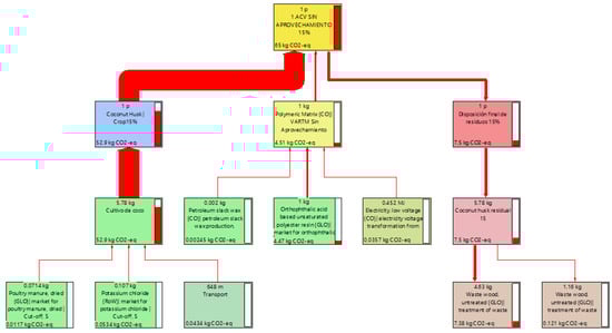 On the other hand, the use of the polymer matrix, as shown in Figure 12D, was the main contributor in all scenarios, since its production relies on hydrocarbon reserves, which are non-renewable resources. Consequently, substituting it with polymers from renewable sources or reinforcing materials could reduce dependence on fossil resources, helping to address environmental concerns such as oil scarcity and excessive waste generation [,]. These results underscore the importance of adopting sustainable practices that encourage the use of agricultural waste, such as coconut fiber, helping to mitigate climate change while fostering a more circular economy.