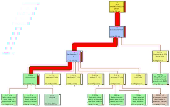 Finally, the Fossil Resource Scarcity (FFP) indicator was the only one that did not follow the aforementioned trend. The CF-CCT/H and CF-CCT/L scenarios exhibited higher values compared to the untreated scenarios. This outcome is attributed to the use of liquefied petroleum gas (LPG) and coal as energy inputs in processes involving chemical treatment, particularly in acetic acid production. According to data from the Ecoinvent database, LPG accounts for 83.3% of the impact in this category. Being a non-renewable resource, LPG significantly contributes to fossil fuel scarcity, as its extraction and use accelerate the depletion of limited reserves []. It is worth noting that Ecoinvent provides reliable, consistent, and transparent data to support sustainable decision-making [,].