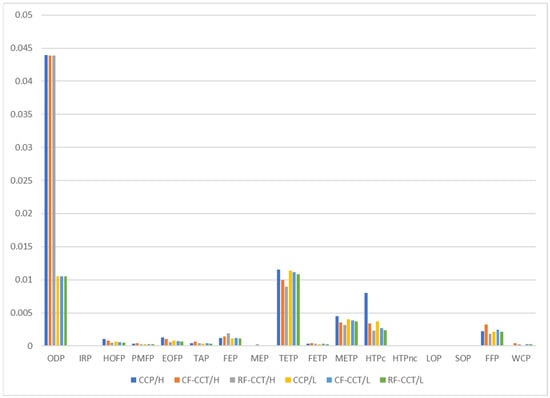 Impact assessment for scenarios CPP/H, CF-CCT/H, RF-CCT/H, CPP/L, CF-CCT/L, RF-CCT/L using the ReCiPe Midpoint (H) method.
