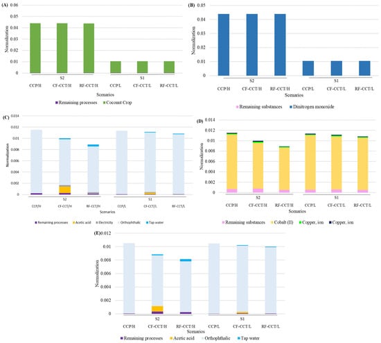 Likewise, the substance that causes the increase in this category is Cobalt (II) (Figure 9D), which, in more than 80% of all scenarios, comes from background processes resulting from the manufacture of the polymer matrix, as it is part of the product’s life cycle according to the inventory provided by Ecoinvent. Similarly, it can be observed that in the RF-CCT/H scenario, the impact is significantly lower due to the elimination of chemical treatment, specifically the omission of acetic acid, which accounts for 9% of the impact in this scenario. A similar pattern is observed in the CF–CCT/L untreated scenario for group S1, where the absence of chemical treatment also contributes to a notable reduction in environmental impacts. Cobalt II emissions (Figure 9E) pose significant risks of terrestrial toxicity, affecting microorganisms, invertebrates, and mammals [,]. When deposited in the soil, cobalt (II) exhibits toxic properties that can disrupt the microorganisms present, affecting enzymatic activity and overall soil health, which in turn negatively impacts plant growth []. Similarly, cobalt nanoparticles have a high capacity for bioaccumulation in vital organs, causing redox imbalance and organ dysfunction in rats [].