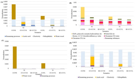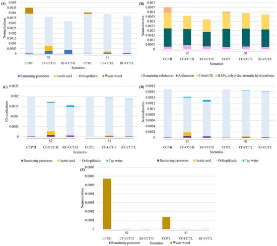 In the case of the Terrestrial Ecotoxicity category (TETP), the scenarios without fiber utilization (CCP/H and CCP/L) showed the highest impact, followed by the scenarios with fiber utilization, first with treatment, then without, for both groups analyzed, S1 and S2. The analysis for this category indicated that the use of Orthophthalic Basic was the main contributor to the impact (Figure 9C). This higher impact in the non-utilization scenarios can be explained by the fact that more polymer matrix is produced in these cases, around 1 kg, whereas in the utilization scenarios, the amount of polymer matrix is reduced. Consequently, the impact values in this category decreased by 27% for S1 and 5.91% for S2, clearly demonstrating that fiber utilization scenarios have a positive effect in reducing environmental impact in this category.
