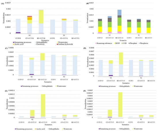 For the Freshwater Eutrophication Potential (FEP) category, the RF-CCT/H scenario showed the highest impact (Figure 11A). The primary contributors were the manufacture of the polymer matrix (41%) and the effluent generated during the maceration process (55%). As expected, the results for emissions by substance (Figure 11B) showed BOD5, COD, phosphate, and phosphorous as the main contributors to the increase in this category. These emissions were predominantly linked to the aforementioned processes (Figure 11C–F). Despite the limited characterization of the effluent, the data proved critical in identifying a significant eutrophication risk, as its discharge into the environment could promote algal proliferation [,], oxygen depletion [] and toxin production [], thus explaining the trends observed in this impact category.